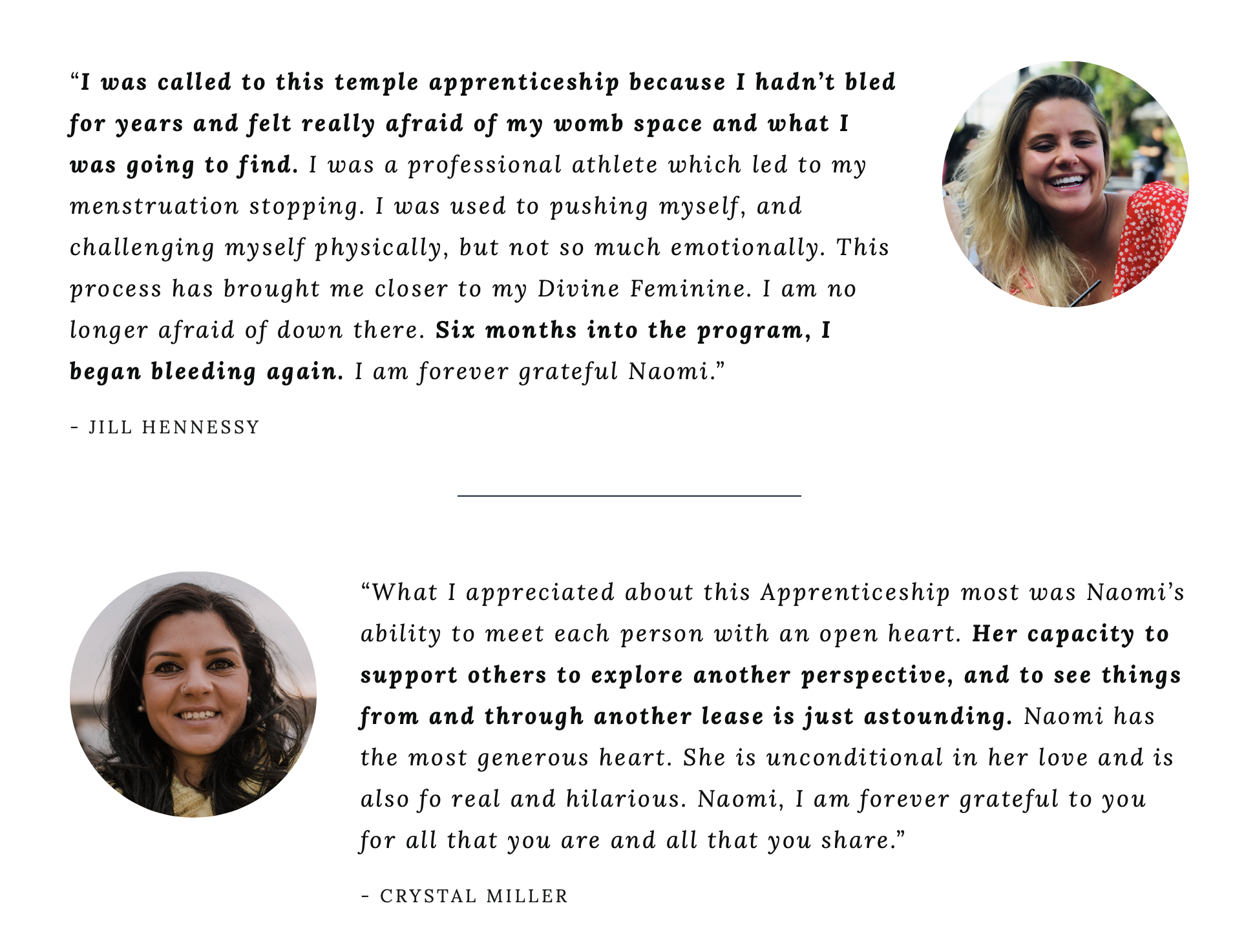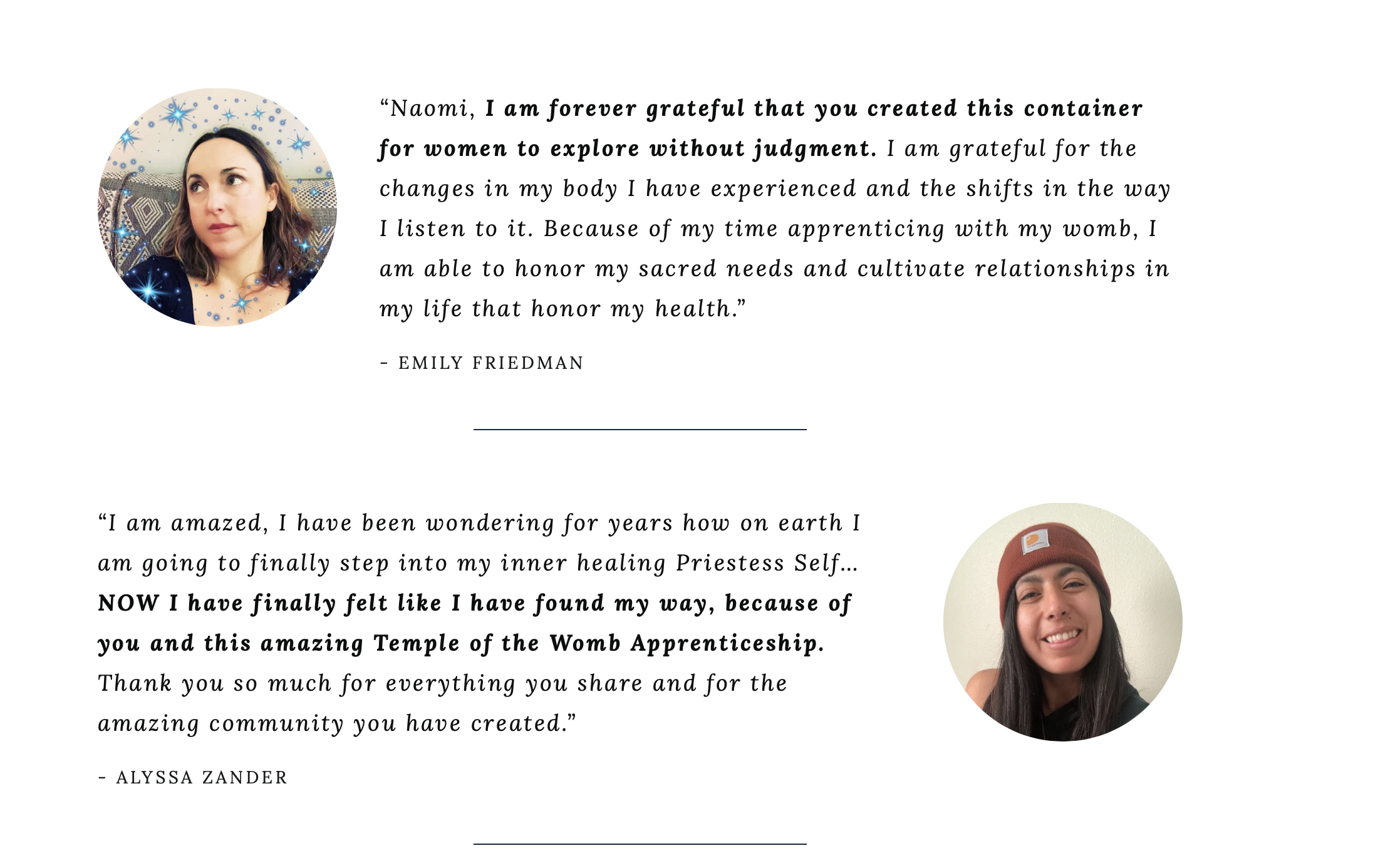 You'll receive unwavering support from both myself and our remarkable community, as you embark on a transformative apprenticeship with your own womb as your inner oracle.